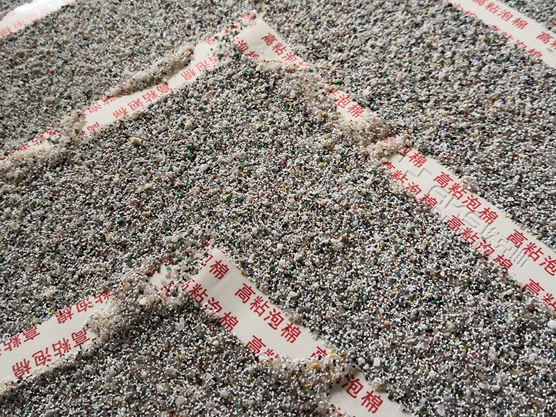 攤鋪膠黏劑,噴撒彩色顆粒,收集多余顆?!B續(xù)同步完成。